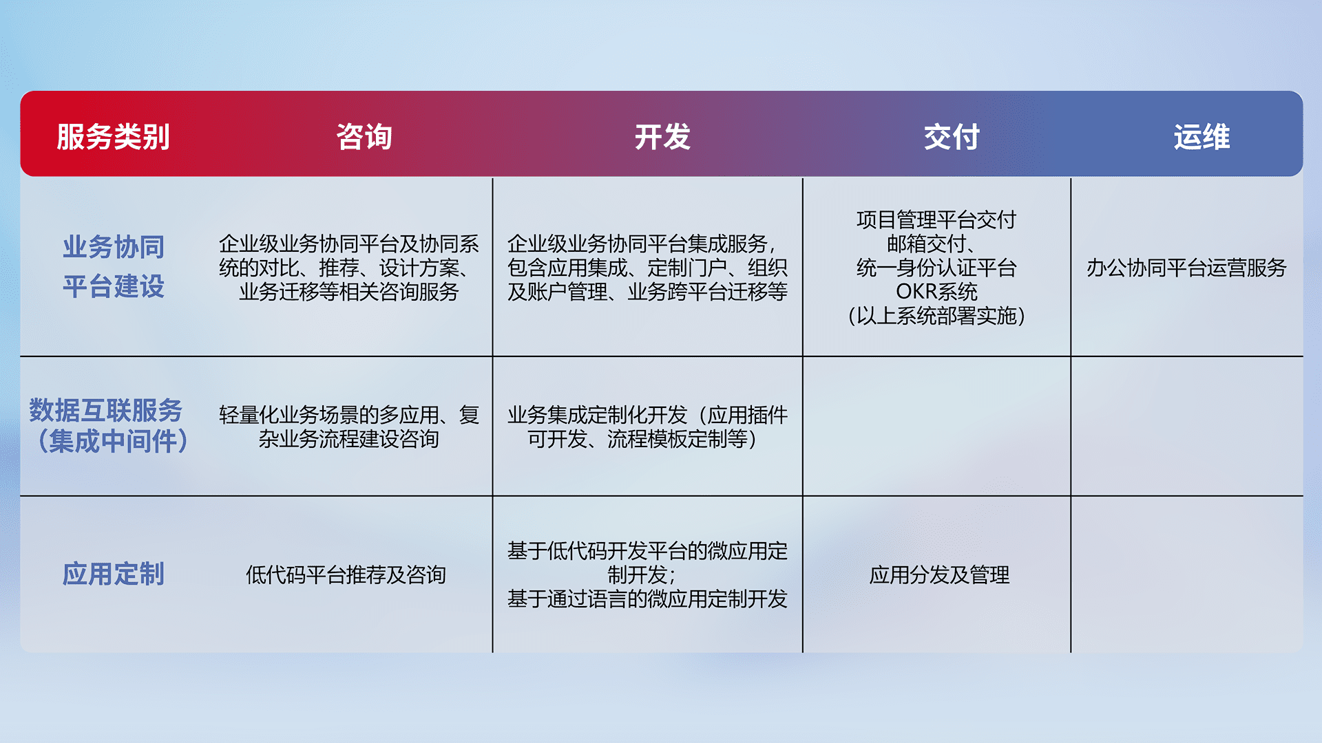 针对钉钉、、、企微、、IDaas等平台级产品提供产品的规划、、、方案、、、交付、、、、定制化开发等服务,,实现如统一协同办公、、、、智能客户服务、、混合会议管理、、、智能数据查询、、等业务场景,,,实现数字化转型。。。